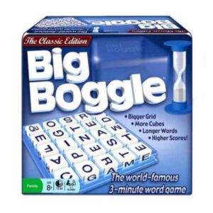 Families still have three minutes to find as many words as they can in each jumble of letters. A special double-letter cube that’s unique to this game helps create those longer words as it also counts as two letters in points. This means that kids can create four-letter words with only three cubes and learn about common letters that go together. Big Boggle also includes 25 plastic letter cubes, a plastic cube grid, a dome and cover, a three-minute sand timer, and illustrated instructions.