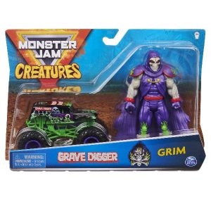 Unleash the beast! Play with your official 1:64 scale Monster Jam trucks like you've never done before with the Monster Jam Truck and Creatures Action Figure Sets! This set includes an exclusive 1:64 scale Grave Digger truck and a 12.7-cm tall Grim action figure. Both truck and figure bring the attitude and larger than life personality of your favourite Monster Jam truck to life! With official BKT tyres, graphics and an authentic chassis, you won't find this Grave Digger monster truck in any other Monster Jam set! Featuring a highly detailed sculpt and five points of articulation, pose your action figure and stomp into action with Grim!