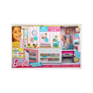 Young chefs can cook up playtime fun with Barbie doll and the Ultimate Kitchen playset! Lights, sounds, colored dough, food molds and more than 20 pieces total provide all of the ingredients for delicious storytelling. The bright kitchen has a cool design with multiple play spaces and realistic working features. There's an oven with a timer that dings use it to bake the pie that rises in the dough mold. On the stovetop, a red light mimics heat and boiling sounds are a life-like touch. The center counter holds a fry press fill with dough, then close and press the top to make fries and hear them sizzle and a sandwich maker that can be filled with dough and pressed to create sandwich layers. Assemble to make a sandwich that looks good enough to eat. A third section of the counter features a mini-fridge with working door below and a veggie mold on top fill with dough, close the lid, press, open and remove healthy-looking mushrooms, tomato slices, a broccoli stalk and carrot.