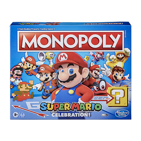 The Super Mario Celebration edition of the Monopoly game offers action-packed excitement along with nostalgia. Choose from 6 tokens designed with the Super Mario enthusiast in mind, and buy, sell, and trade locations from iconic Super Mario games. It features beloved characters and themes through the years, all the way back to 1985 and the first Super Mario Bros. video game. The Monopoly game features a Question Block with sound effects that can change a player’s luck. Toad houses and Princess Peach’s castles replace houses and hotels. The board game is a great gift for gamers and a birthday or holiday gift for Super Mario fans, ages 8 and up. Monopoly: Super Mario Bros. Celebration! Edition Board Game Hasbro GameStop.