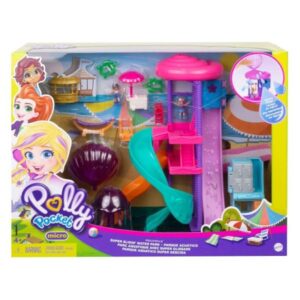 Get ready for splashy Polly Pocket fun at the Pollyville Super Slidin’ Water Park! Micro Polly and Shani dolls are so excited for a day in the water! They head to the freestanding ticket booth to get their tickets and then the locker room (door opens) to change. Now it’s time to make a splash at the water slide with real running water! Take the purple seashell and fill it with water, then place it in a hole at the top of the slide and squeeze! Wow–water runs down all 3 slides! Place Polly doll in the blue elevator and press the door – whoosh — Polly doll goes down the slide! Put Shani doll in the innertube and she slides down the winding slide! Also place the seashell filled with water in the top of the jellyfish –squeeze — and the jellyfish fountain flows with water! Fill the bottom of the playset with water and the dolls can float around in their floaties! So cool! When the girls need a break, they can grab an ice cream at the cart, relax in the beach chair, keep an eye out in the lifeguard chair, swing in the hammock and get a refreshing drink at the tiki bar! It’s so much fun at the Super Slidin’ Water Park! Playset includes micro Polly and Lila dolls, water park with 3 slides and jellyfish fountain, ticket booth and locker room and accessories.