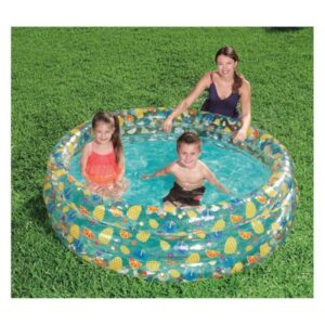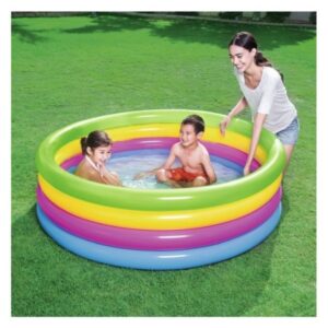 The colorful 4-Ring Play Pool from Bestway® measures 1.57m wide and 46cm high which makes it the perfect size and shape for splashing about or relaxing and taking it easy. There's even room for some friends too! Features safety valves, sturdy pre-tested vinyl and has a water capacity of 522 litres.