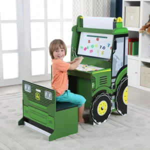 Deere Tractor Easel complete with artist desk and chair with storage makes this a perfect item for any young child to enjoy. Constructed of sturdy 1/2" thick mdf (no harmful chemicals) and finished in the recognizable John Deere green. The oouter surfaces have multi-colored images of tractor tires, windshields, headlights, mirrors, etc. with the John Deere logo on the "front" of the tractor (outer backrest of chair). The Easel itself has a roll of white artist paper (which may be replaced when finished) on the top which may be pulled down for use or to tear off. The top front "windshield" portion has a whiteboard and there are markers, eraser, letters, etc. included. There is a chair with storage that pulls out in front just above the John Deere logo.