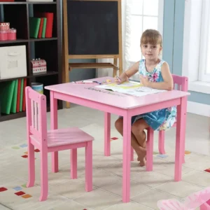 Exciting, new John Deere Table & Chair set in the recognizable Pink comes with two chairs. This set features a table constructed with a 1/2" thick sturdy top constructed of medium density fiberboard (no harmful chemical) and features the John Deere logo and name in the center of the table top. The legs (1.5" thick) and apron are finished and attach easily to top of table with nuts & bolts (included). Set includes two chairs measuring 14.5"W x 11.75"D x 26"H and feature solid pink seats (14" H from floor) and three spindles in the backrest. Remainder of the chairs are painted in solid pink John Deere . Easy to assemble with hardware included. This is the perfect table and chair set for use as a play surface or for that extra seating during busy holiday meals. John Deere Table & Chair Set - Pink