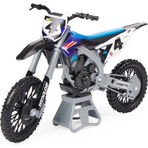 Bring the action of Supercross home with the official 1:24 scale die-cast motorcycles and riders! These authentic racing bikes include riders attached onto their bikes and put the Supercross action in your hands. With the race ring (included) looped around your finger and attached to the back of your rider, you can become part of the adrenaline-fueled world of Supercross! Roll your bike by hand, pop into wheelies, pull off epic tail whips, jumps, turns and more, just like youve seen in the live events! Plus, you can even wear rings on different fingers to race multiple bikes at once! Featuring realistic details, graphics and metal die-cast motors and forks, the 1:24 scale Supercross dirt bikes and riders look just like the real thing only fun size! Collect all of your favorite pro riders and their bikes, including Justin Barcia, Ricky Carmichael, Aaron Plessinger and more (each sold separately) and turn your world into a Supercross stadium! Each 1:24 scale bike also comes with a unique collector poster featuring your rider that you can hang on your wall. Recreate the excitement of Supercross right at home with the official 1:24 scale motorcycles and riders